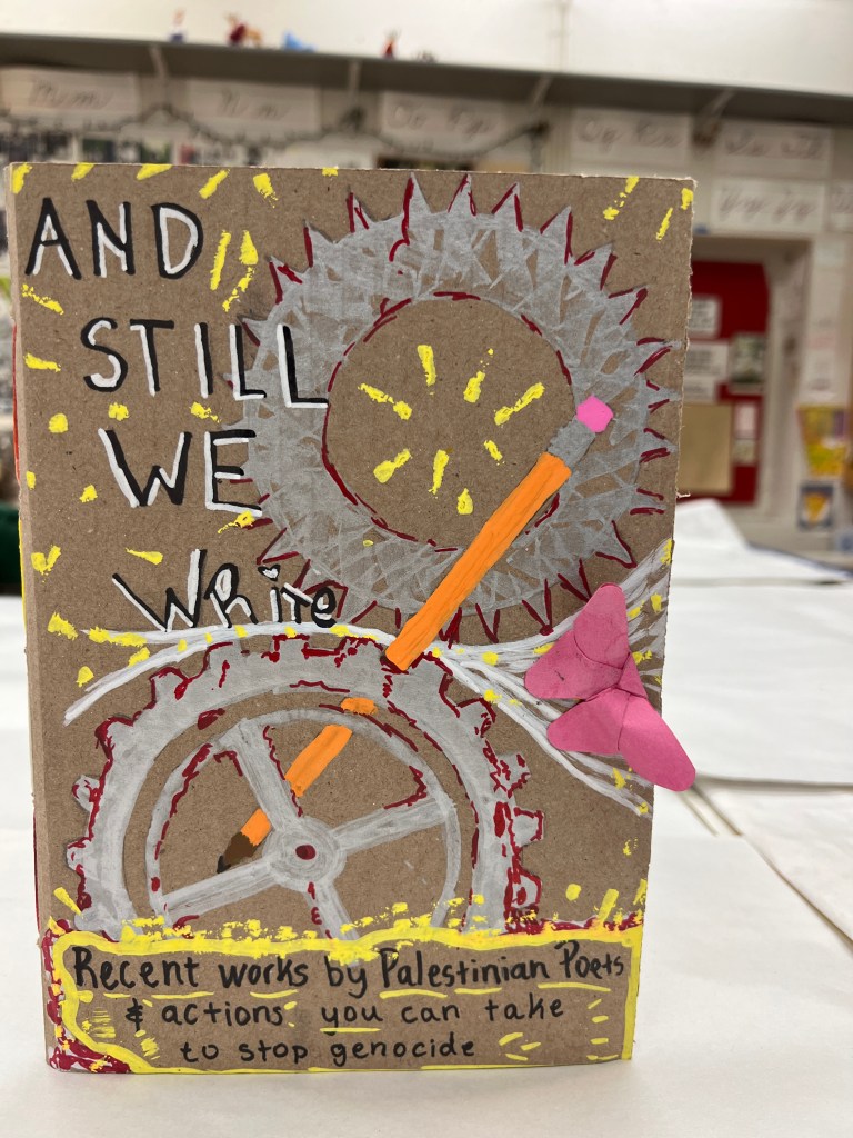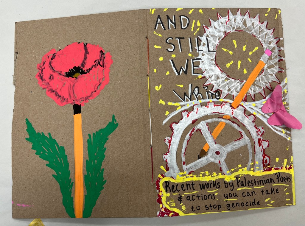 And Still We Write. Recent Work by Palestinian Poets & Actions You Can Take to Stop Genocide Now, by Nasser Rabah, Maryam Al Khateeb, Heba Al-Agha, Batool Abu Akleen, Asmaa Dwaima, Basman Eldirawi, Doha Kahlout, Mahmoud Alshaer, Esam Hajjaj, Mohammad al-Zaqzouq, and Samer Abu Hawwash (Publishers for Palestine/Andaleeb Cartonera, 2024)