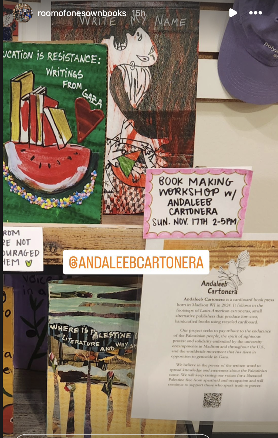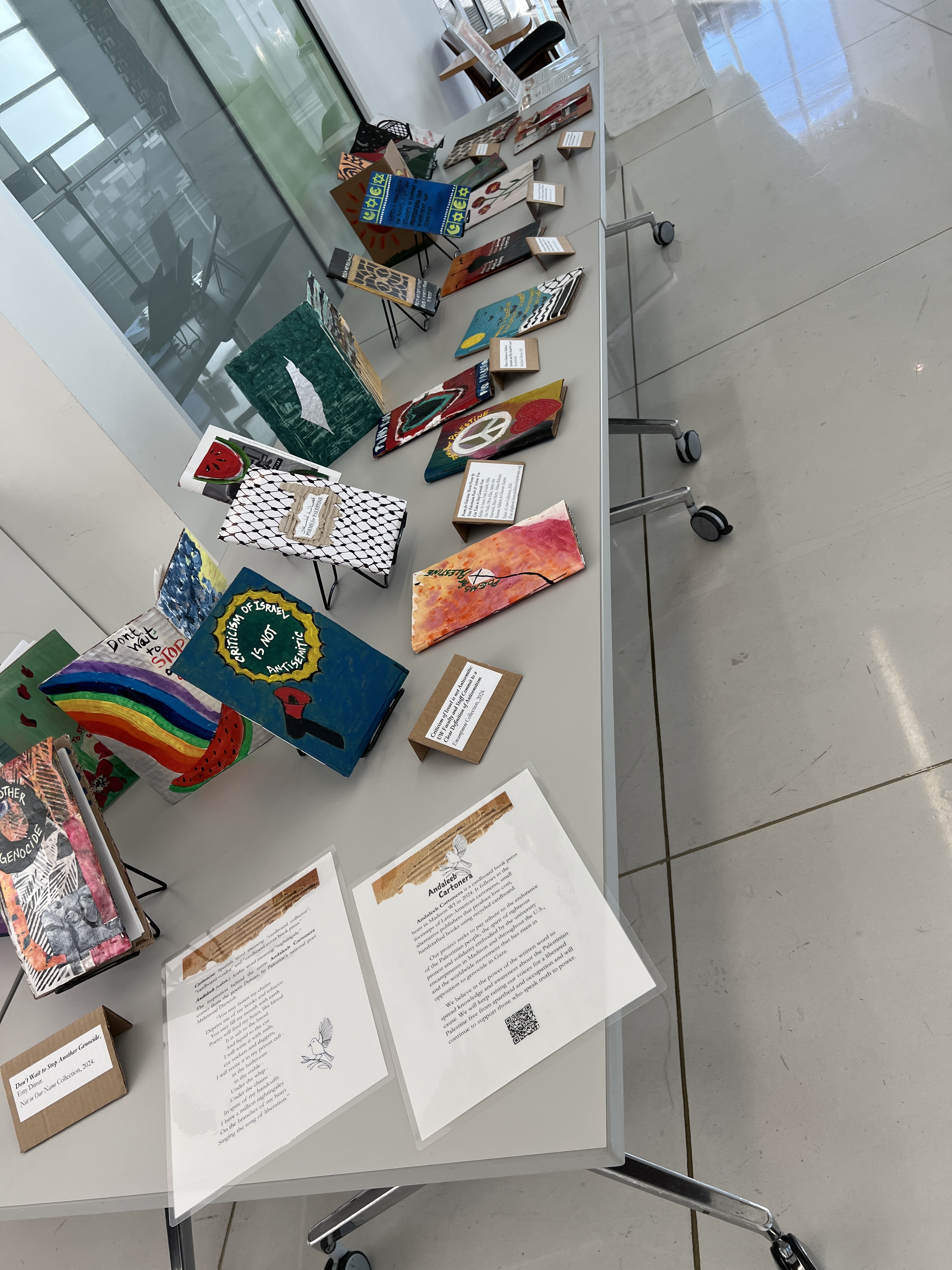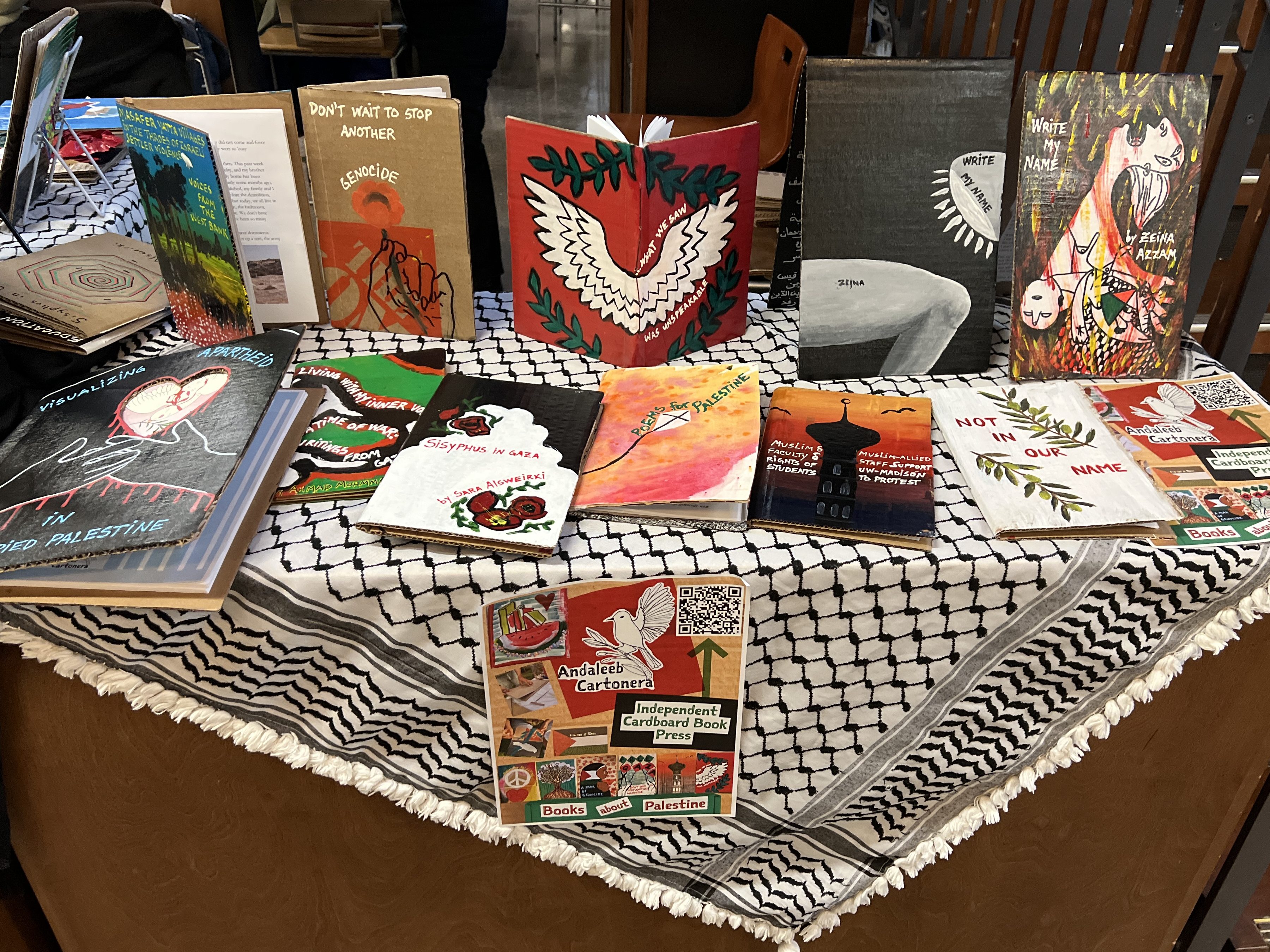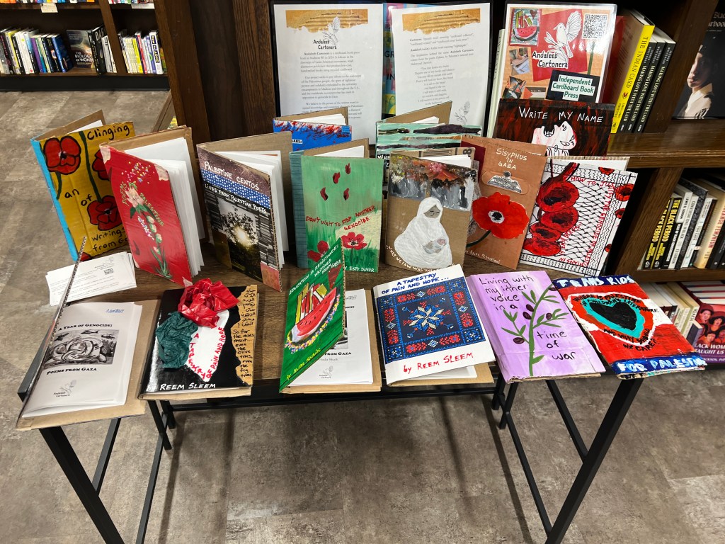 We have displayed Andaleeb Cartonera’s handcrafted books in different venues to showcase our titles centered on Palestine and the authors collaborating with us. If you would like us to bring a display to your institution, library, bookstore, school or solidarity event, feel free to contact us.
