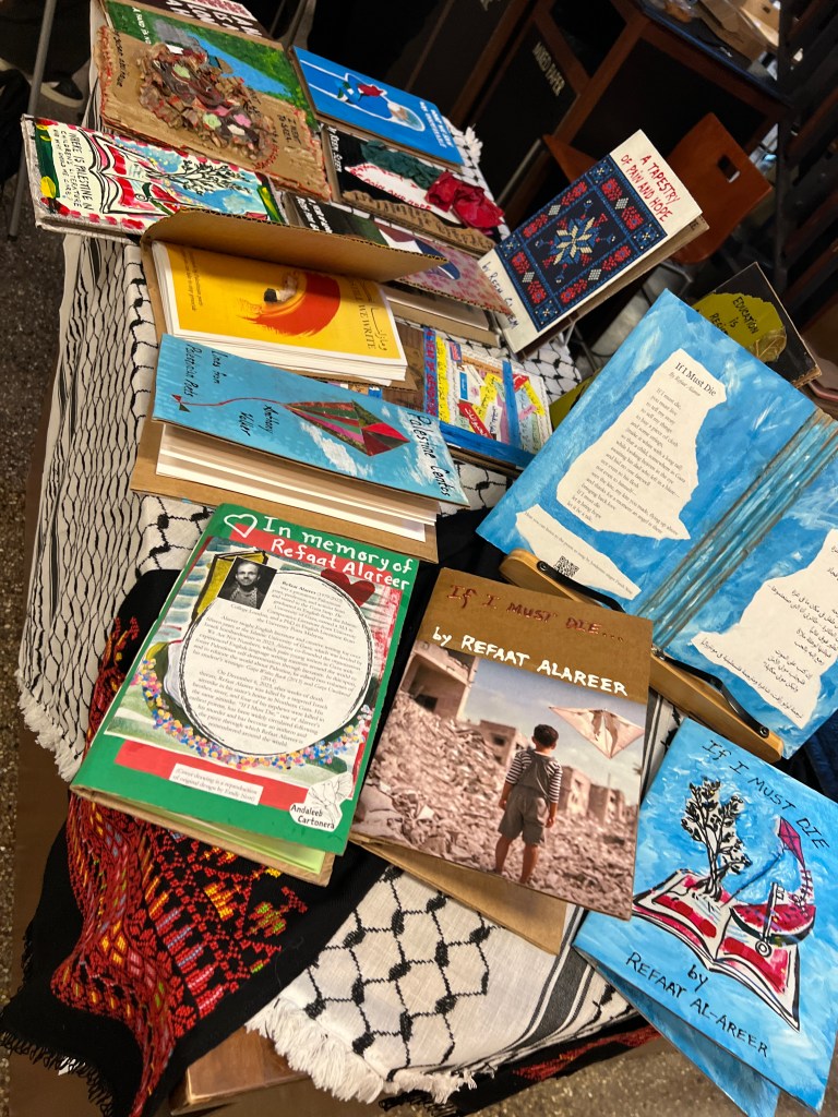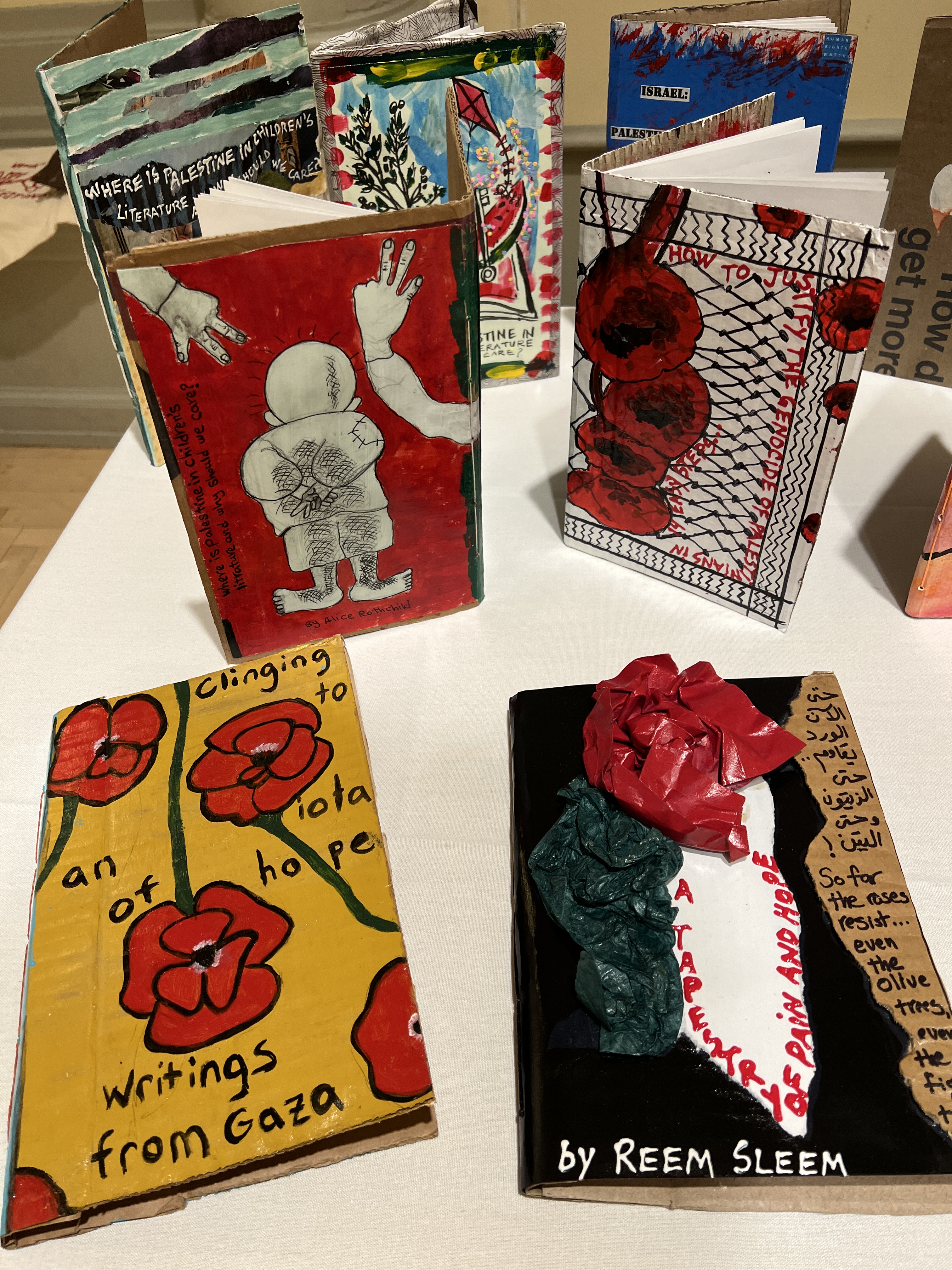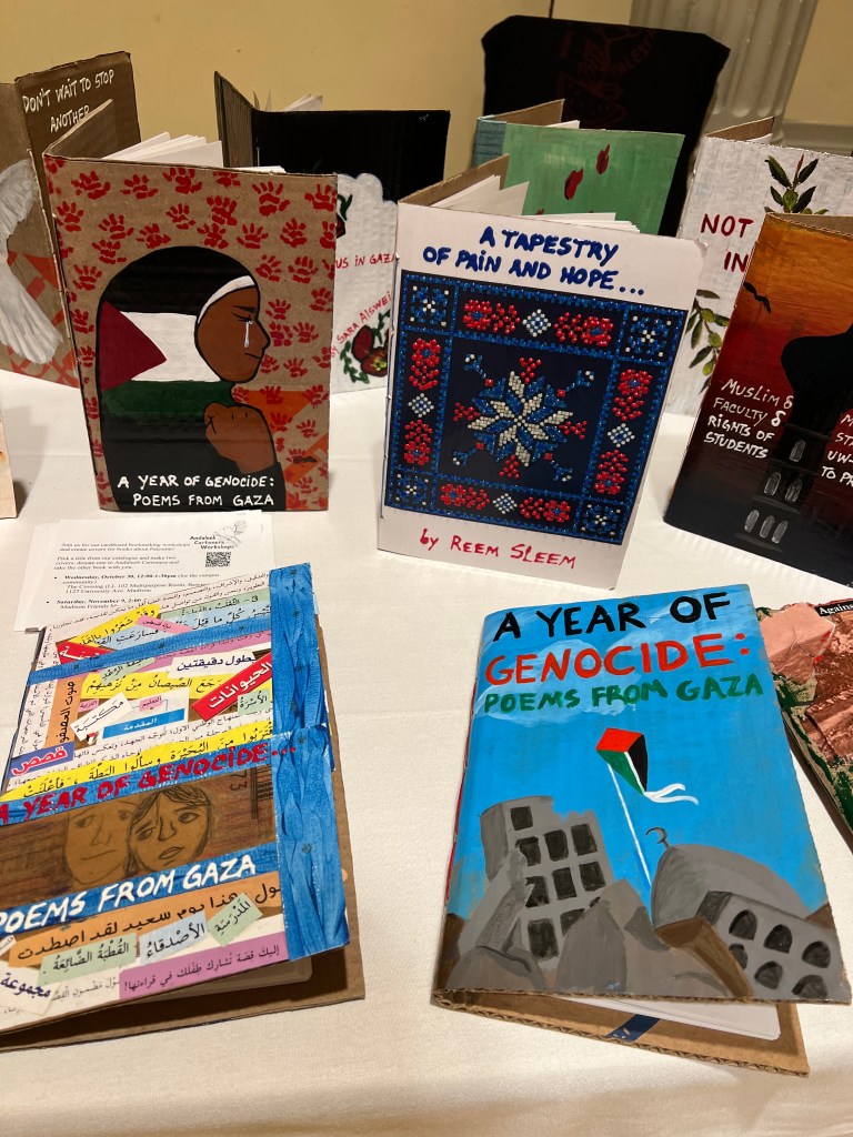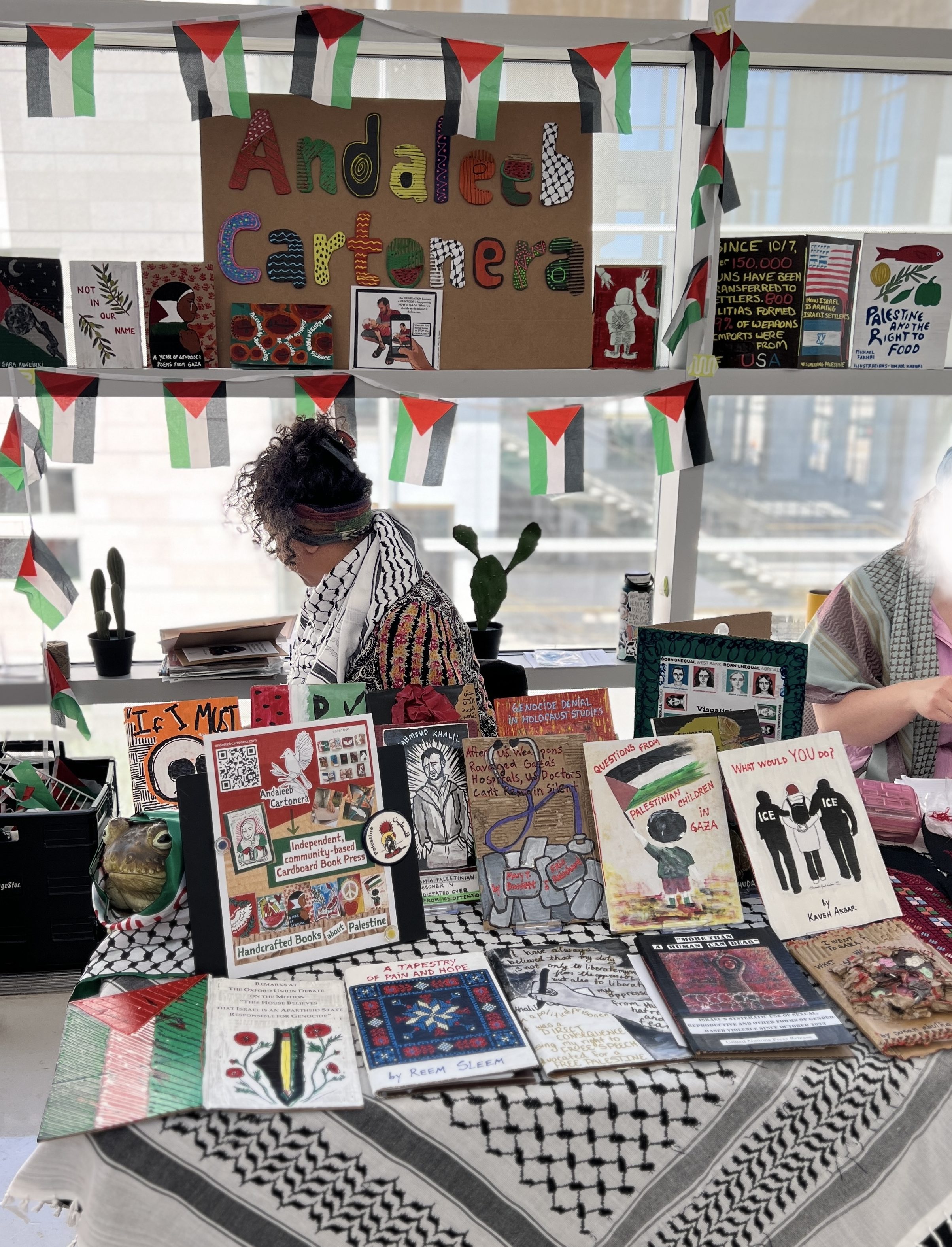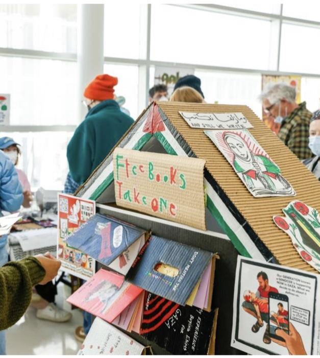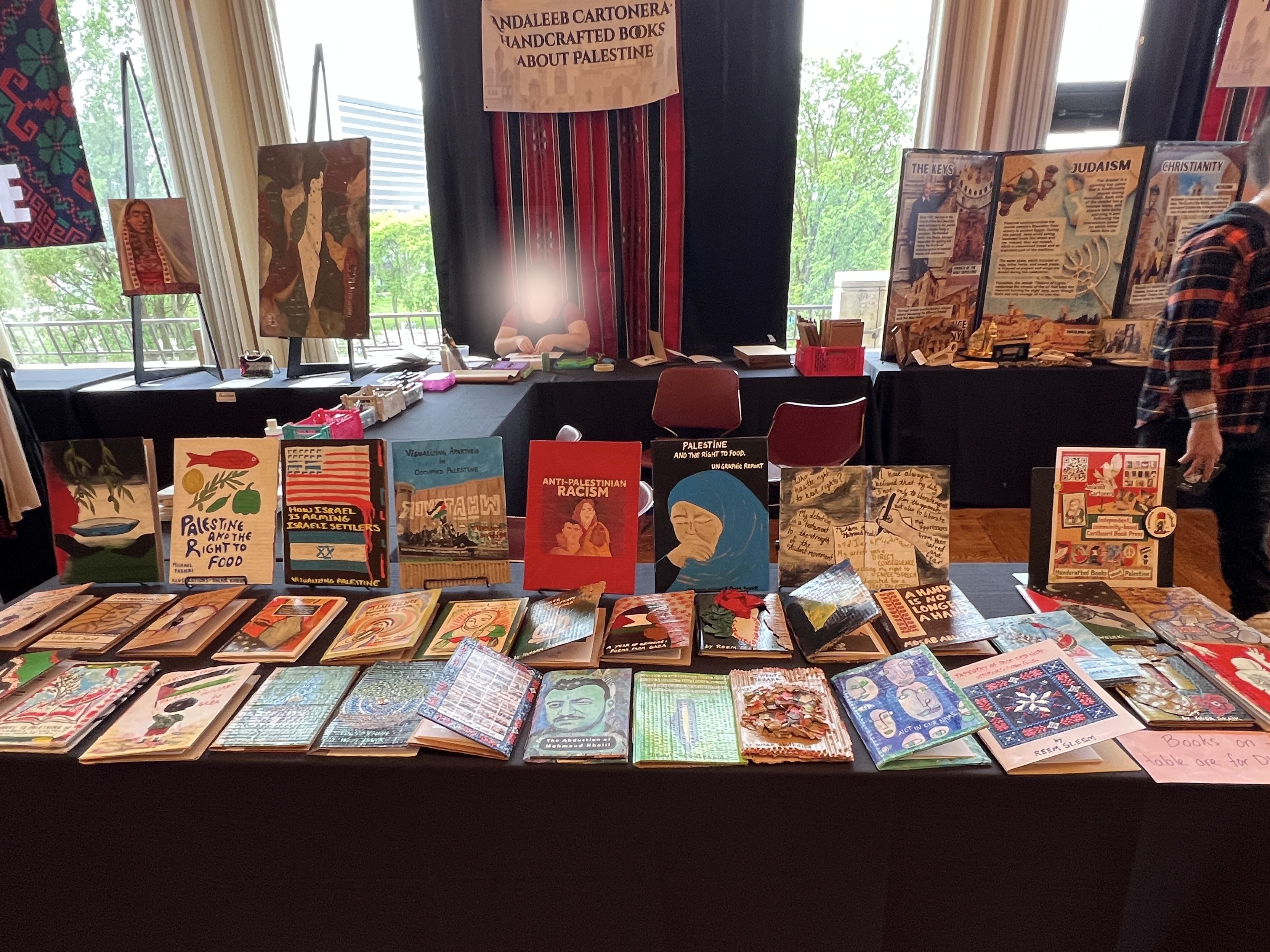 We have displayed Andaleeb Cartonera’s handcrafted books in different venues to showcase our titles centered on Palestine and the authors collaborating with us. If you would like us to bring a display to your institution, library, bookstore, school or solidarity event, feel free to contact us.