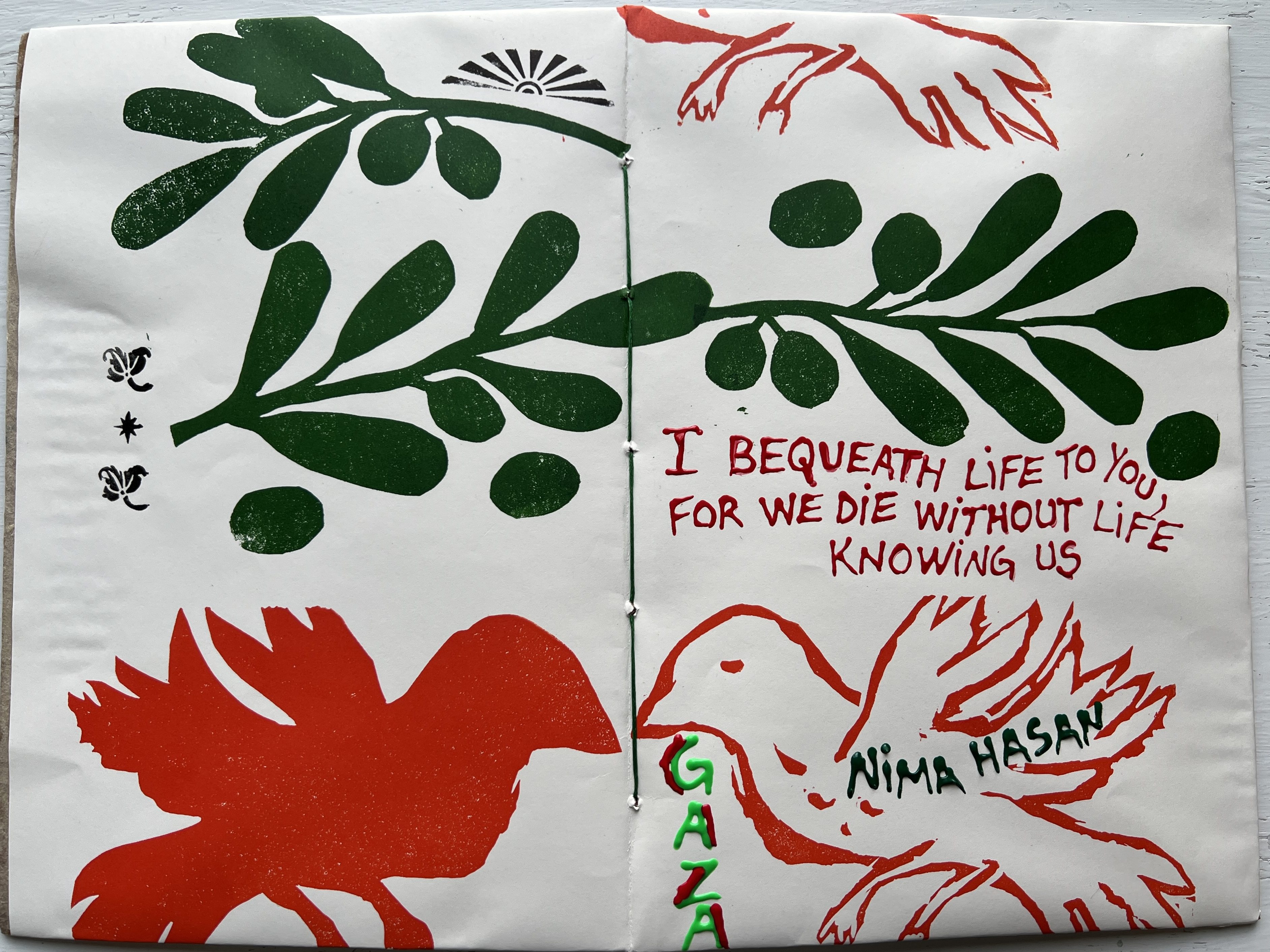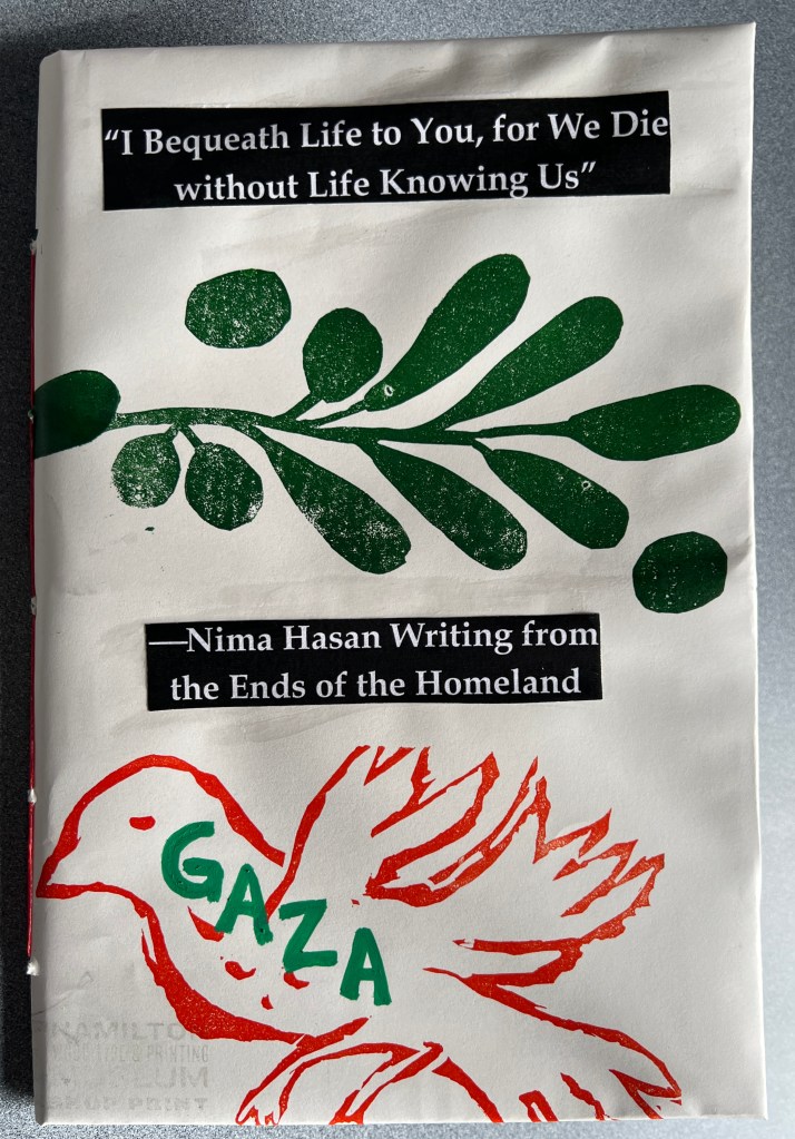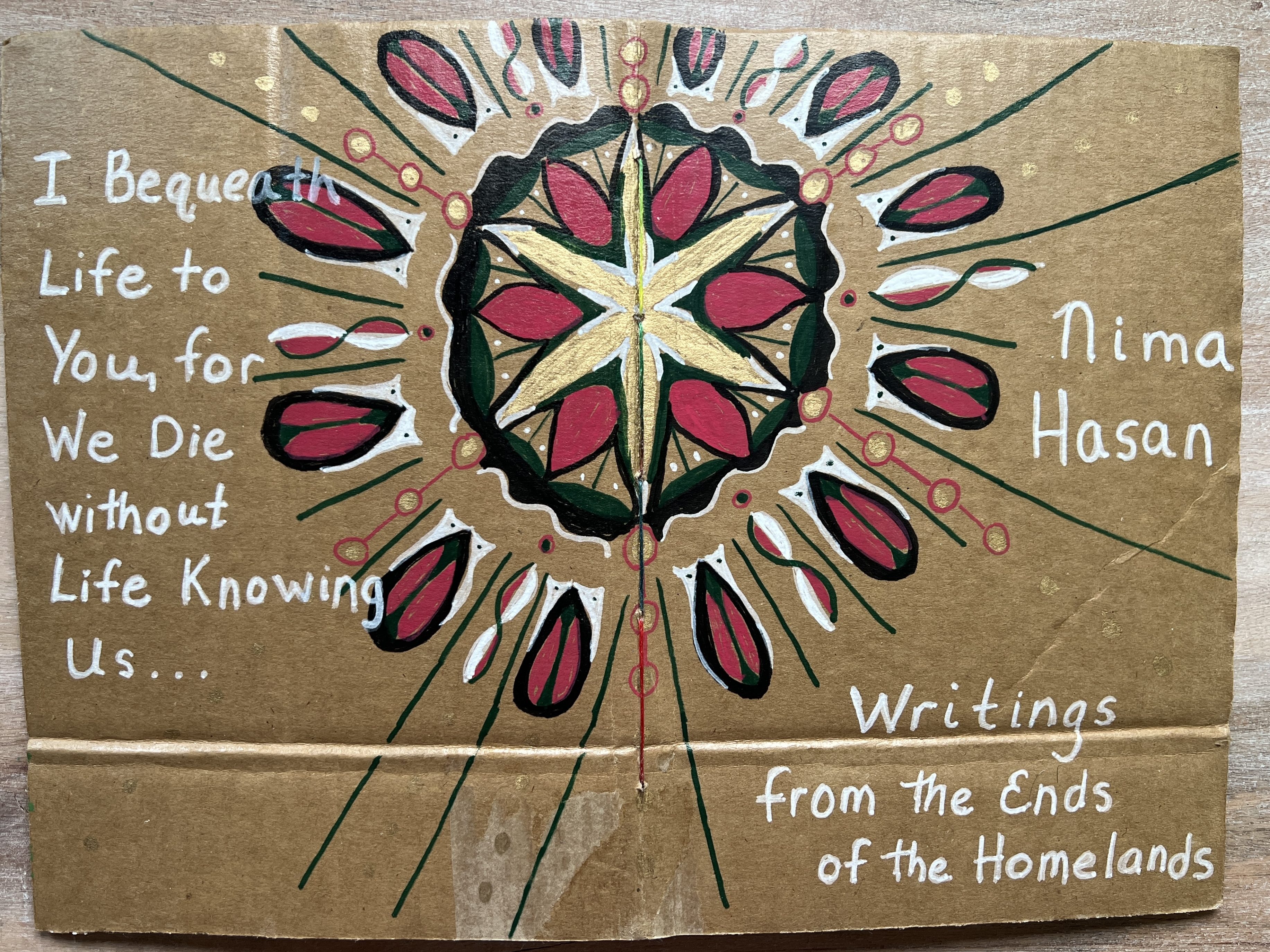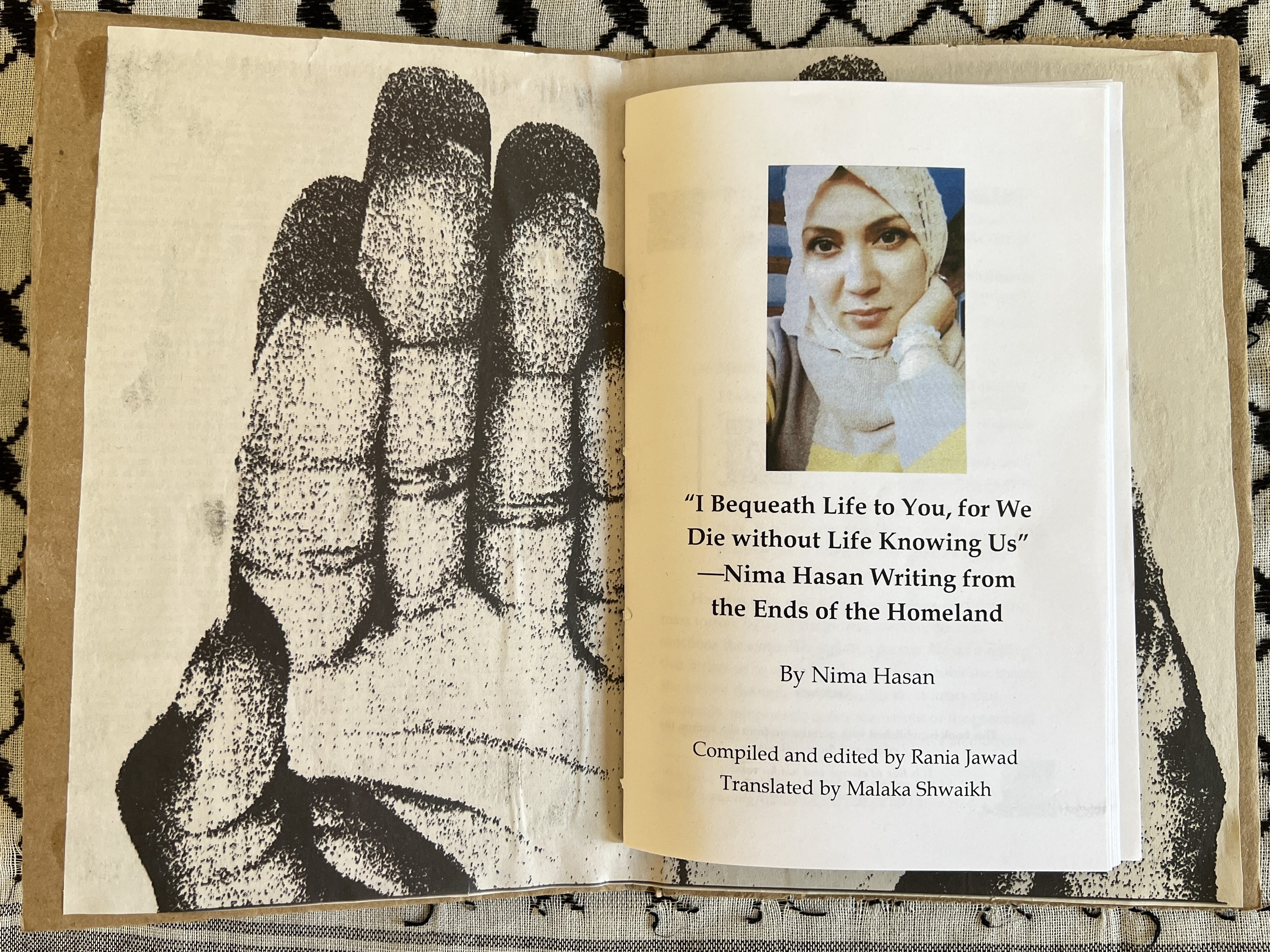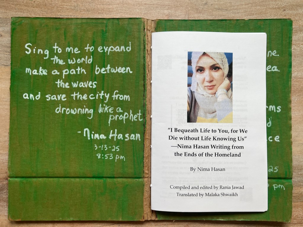 “I Bequeath Life to You, for We Die without Life Knowing Us.” —Nima Hasan Writing from the Ends of the Homeland, by Nima Hasan. Compiled and edited by Rania Jawad, translated by Malaka Shwaikh (Andaleeb Cartonera, 2025)