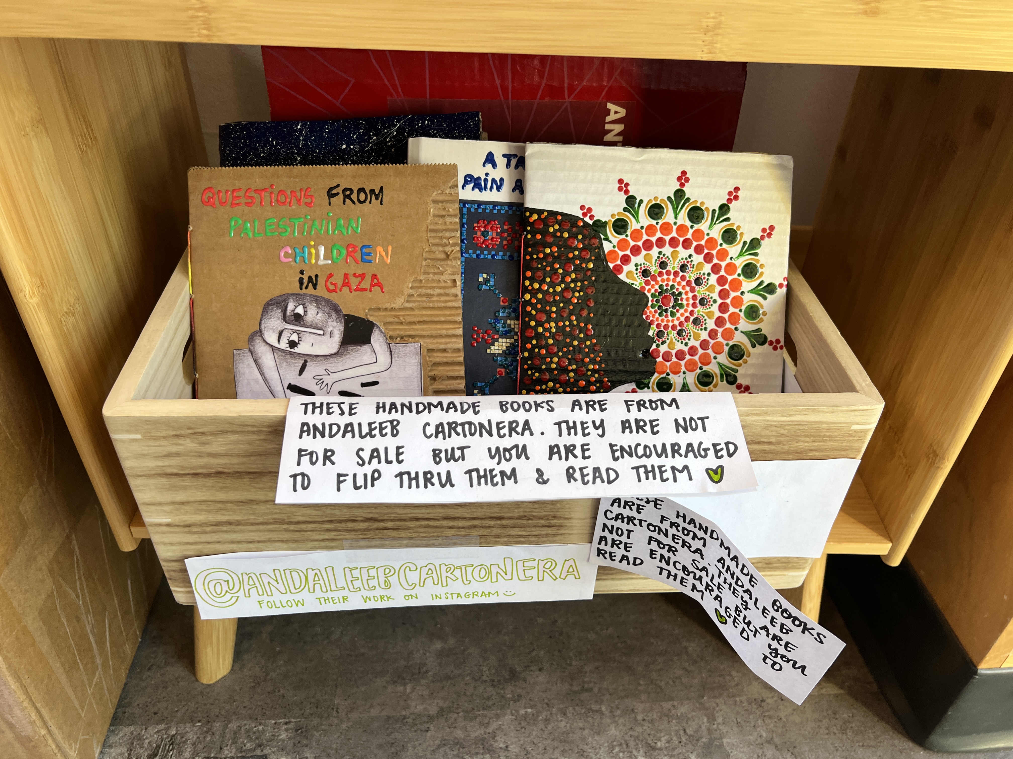 We have donated books to The New York Public Library, the Islamic Lending Library of the Muslim Women’s Coalition in Wisconsin, the UW Archives and Records Management, the Wisconsin Historical Society, the Small Press Library at the Arts+Literature Laboratory, the Comics Room, and a few Madison school libraries. If you are a librarian and can assist us in getting our books added to local libraries or school libraries’ catalogues so patrons and students can borrow them, please contact us. If you would like to use any of Andaleeb Cartonera’s books for a course, or add it to your curriculum, feel free to contact us as well.
